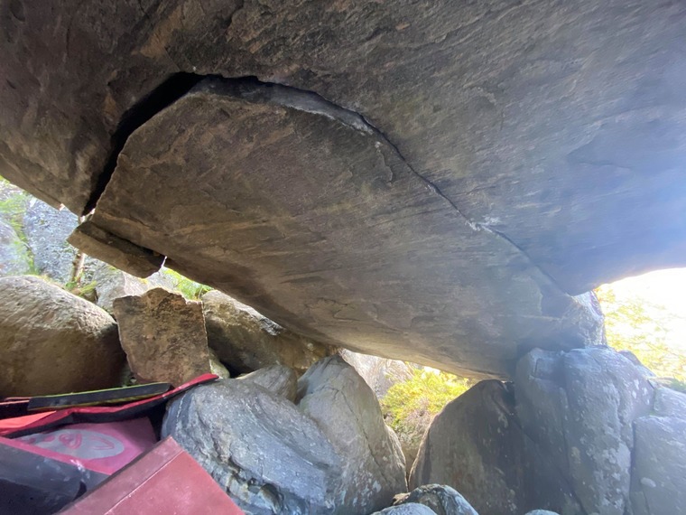 Unique line! Start with underclings and feet on the smaller rock. Follow the crack and top out on the other side of the boulder.