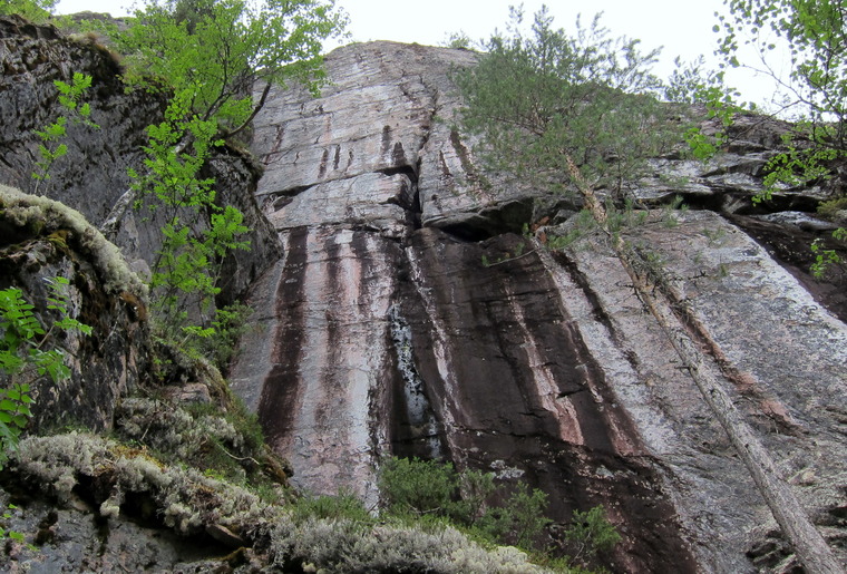 60m. Start dihedral for 5m then traverse to the right then splitter to the top. Shares anchor with other trad.