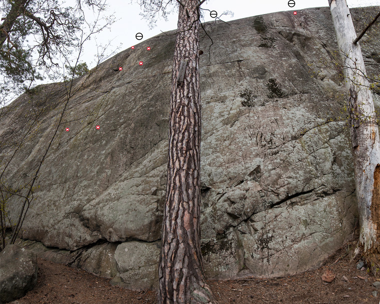 Jag gick ut till höger i slutet mot tallen. Rakt upp är det skitigt och osäkrat. Det rimligaste är nog att gå in i leden till vänster på nåt sätt, som Tim skriver. Bara man ser till att inte skippa flytten ovanför tredje bulten: de är inte lätta och man kan nog falla, jag gjorde nästan det. Jag la inga egna säkringar, pallade inte hänga och lägga när det ändå är så lätt till nästa bult.