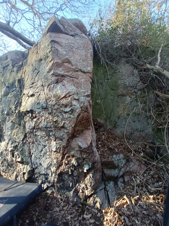 Sitt start på hyllan. Följer den trubbiga arete rakt upp. Lite knepig topp