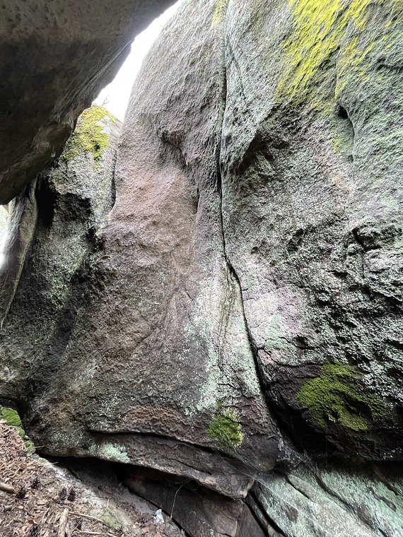 Red 14g, climb the thin crack between the boulders, quite hidden