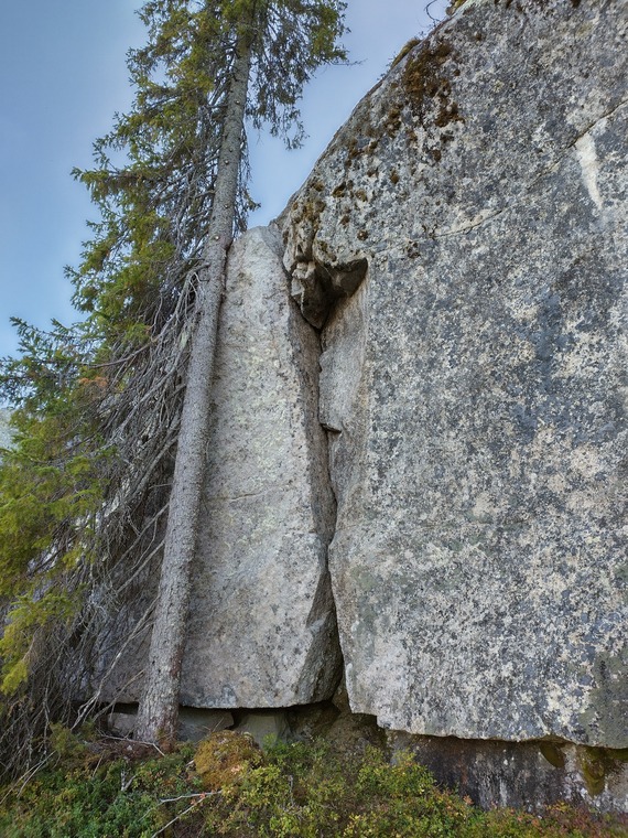 Top anchor missing (Sep21), but can be easily climbed to the the top tree. ~25m rappel to the ground or scramble from lookers left (from the ground).