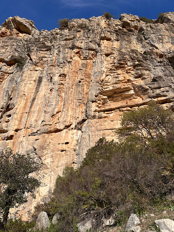 Less than ideal bolting with hard moves above ledges. Rebolted in 2022.
