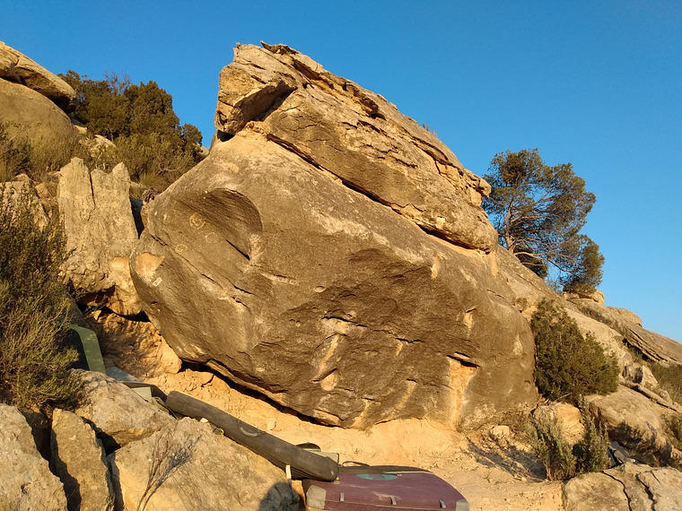 Sitstart from good sloper for the right and tiny "knob" for the left hand ... Watch out, the overlying rock is total choss!!