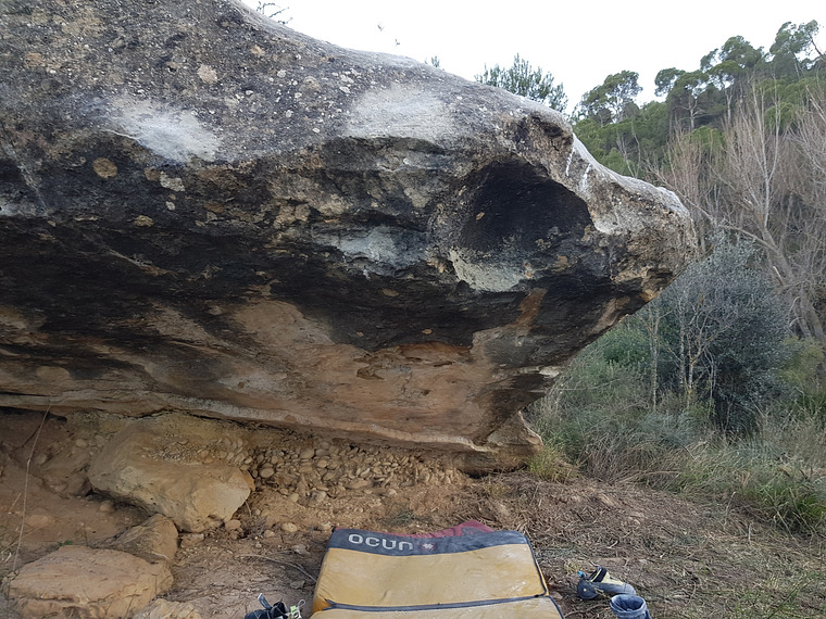 Sitstart, left hand and right hand at two finger pockets, climb straight to the lip. Use thick Pad if necessary to reach the pockets comfortably. FA Felix Popow