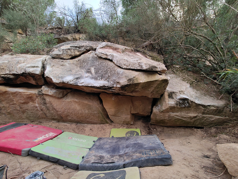 Sitstart like "Tropicalm", traverse left, top out like "Knee for rest".