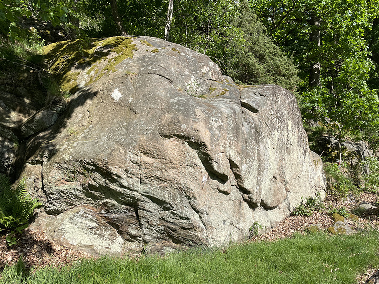 Start on the left side of the boulder with both hands on the big hold. Traverse right and end in the problem "Fogsvans boogie"