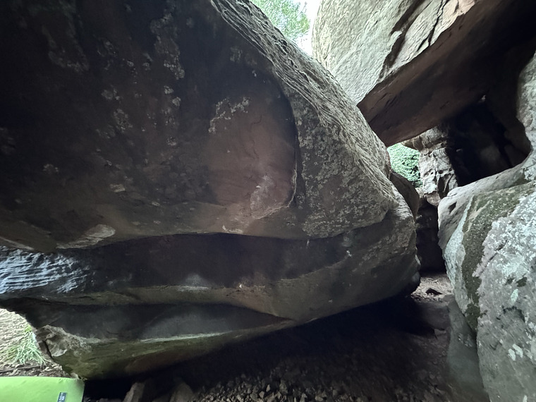 Sit start, climb right following the crack. Topout without the hanging block on the right