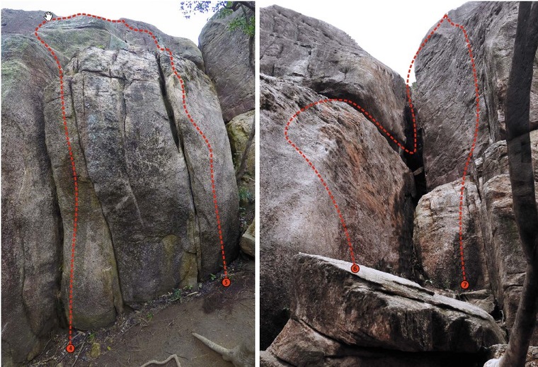 Follow the obvious vertical crack on the right of "No! No! No!" then mantel on the wide ledge and keep the left. Climb up the ridge till the lower off.