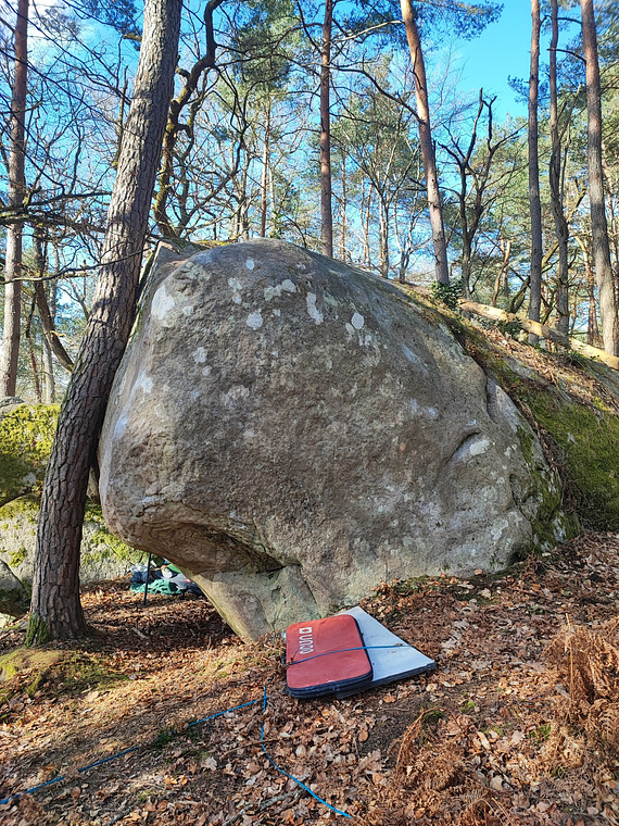 Start on the right jugs, traverse on bad slopers and not existing foot holds to the left. Exit on the right side of the arete with the jug. Top holds (tall can reach them) eliminated, use the bad sloper!