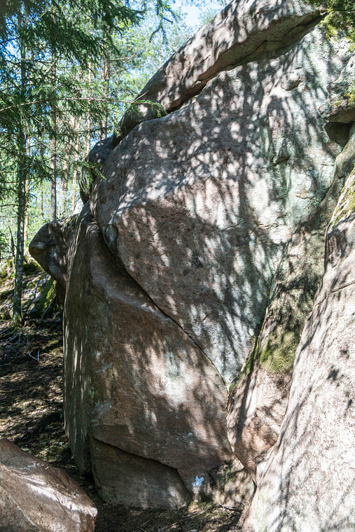 Sittstart från bra krimp med vänsterhand och bra pod/pocket till höger om sprickan. Gå ganska rakt upp via krimpar, pinches och sidepulls. Är du och fingrar på juggen långt in i sprickan upp till vänster är du för långt till vänster. Rampen nära marken till höger är off. Känslig och fin.