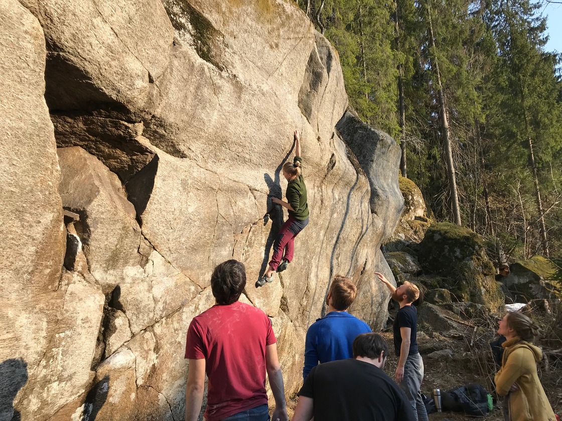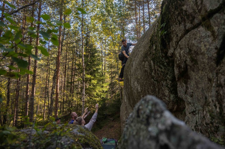 ⭐ Speidersteinen is probably the most known "beginner boulder" in Østmarka, and is a free-standing rock with routes all around it. The boulders is surrounded with other walls as well, and can offer some tall slabs and even highballs. Katteparken is a collection of free standing rocks with lines on the low to medium grades, mostly. The nearby Skøyenhylla offers some taller boulders, and a few higher grade routes as well. Kontor- and Hjemmekontorveggen offers some good wall problems as well, from easy grades up to 7c. If you like slab climbing, why not try out sectors Rakettveggen and Ubåtveggen, which offers beautiful slab problems on a wide range of grades.