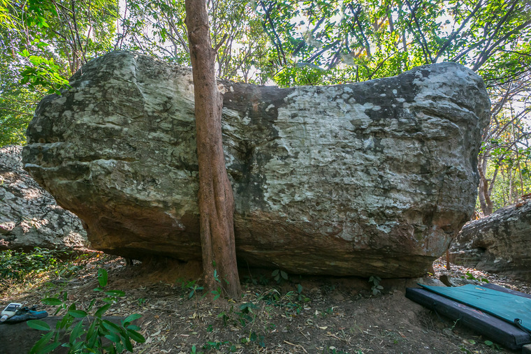Sit start. Both hands on lower hold on the left side of corner. Climb up the face on the right side.