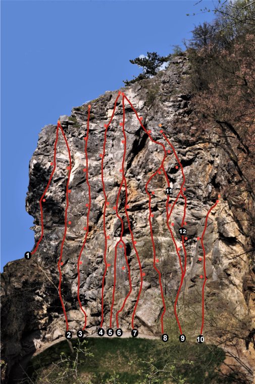 Jištění: 3 bh + sl. Popis: Vpravo od cesty Převis Zprava, pilířem (2 bh) do položeného (bh) a přímo ke slanění.