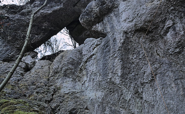 Follow the street up north until the next bend. Pass the bridge to your right and turn right onto the hiking trail. After 120 meter there's a regulation sign at the path that leads you tu the wall.