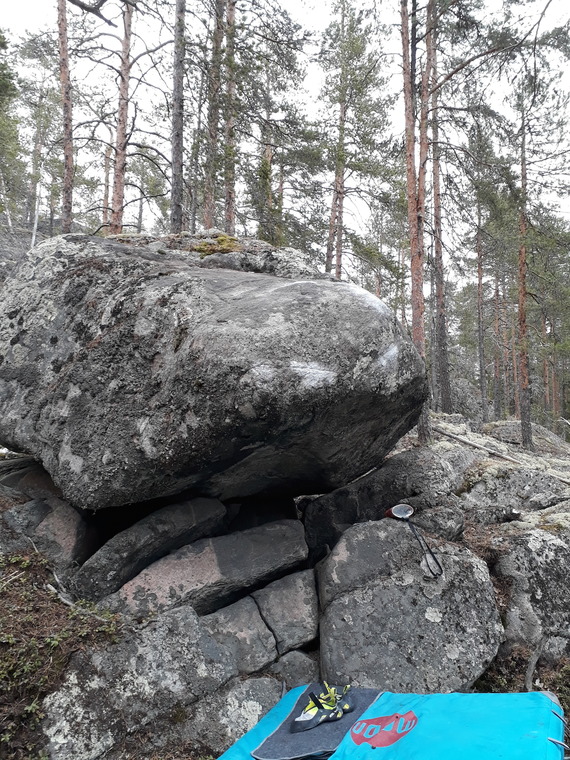 Standing start with hands on the two crimps. The stones below the main block is allowed.