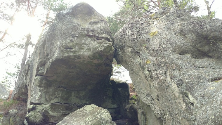 Start from a slippery ledge. Climb the roof with the left arete and exit at the nose. Sketchy landing.