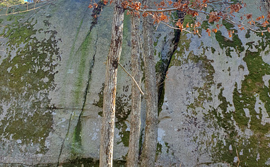 Denne veggen er litt vanskelig å spotte fra stien. Det enkleste er nok å gå frem til den lille gamle eika hvor man går bratt oppover mot Rullesteinsbukta, vinne litt høyde i terrenget og se seg tilbake samme retning man kom ifra. Klippen sees tydelig på høyrehånd.