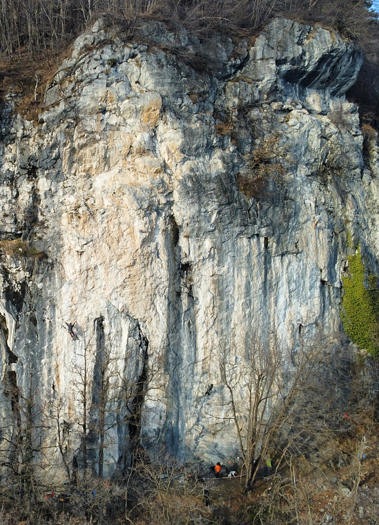 7a+/b. Follow a crack/flake (6c) and then a boulder move at the top.