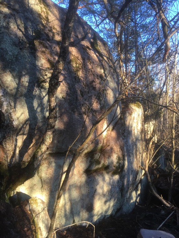 Start on the huge jug. Climb the middle of the tall face and exit under the rotting tree, a bit too high for comfort.