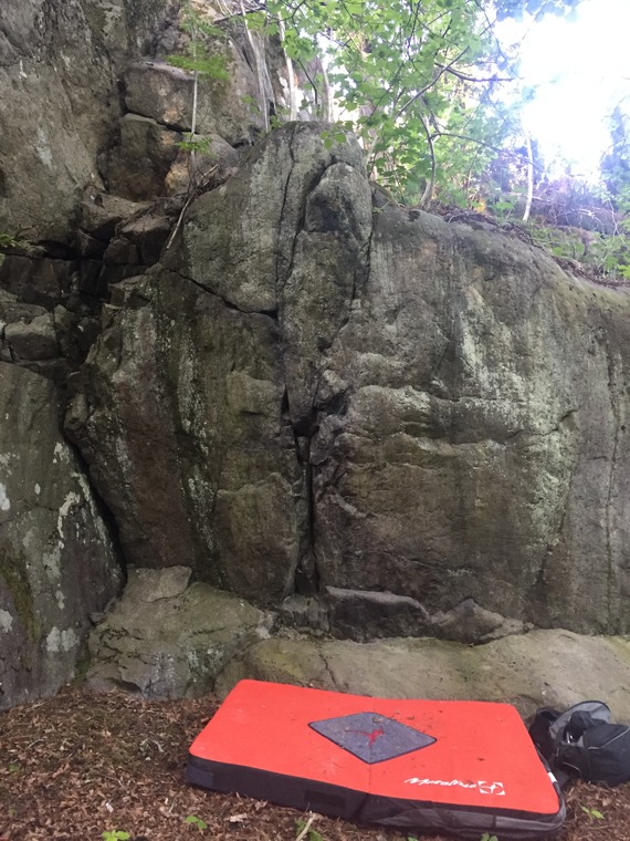 Start on same holds as Child's Play, but miss the hard move(s) by reaching left to the big hold on the arête then coming back. No feet allowed on the wall to the left.