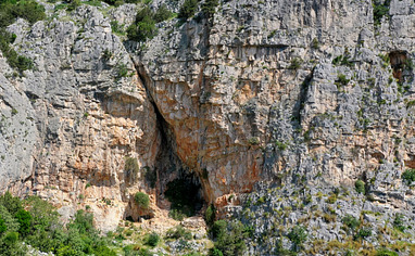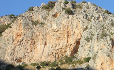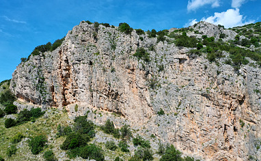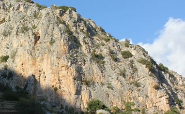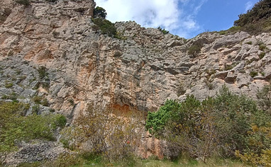 From the parking lot follow the well-established path, partially marked with stone pyramides towards the rock face (5-10min).