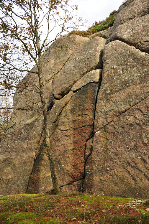 Sprickan längst till vänster. Rakt upp, avsluta med övre eller under traversen till hyllan.