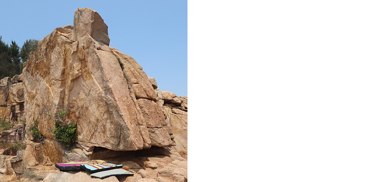 To the left of the prominent arete is a diagonal line of intermittent crimps. Use these and poor features out on the left wall to work your way up to jugs at the lip of the block. Continue directly over the perched block to finish.