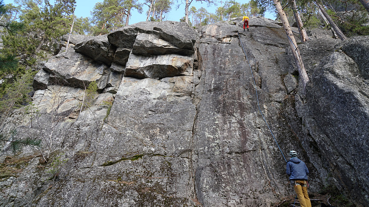 Fin platta med små grepp och steg. Säkrades under förstabestigningen med kilar, men är nu helbultad.