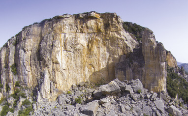 On the upper level of this garden, go left and pass the fence without ruining it. After 100m follow a small path to the right that goes up to an old dirt road. take this road to the left. After a few 100mt you will see a gigantic boulder on your left, shortly after a vague path goes up to the right towards the big face.
