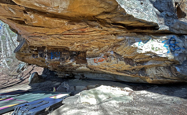 Hiking Directions: From the parking, keep walking further back the road. The Chips Boulder will appear overhanging the road about 0.1 mile after the road shrinks to an ATV road. The Dot and Kibble Boulders are straight downhill from the Chips Boulder in the talus field. The Saw Tooth, Turkey Wrangler, Fungal Infection, and Resistor Boulders are all just ahead on your right and the Struggle Bus, Life in Color, and Beetle Mania Boulders are just ahead of those on your left.