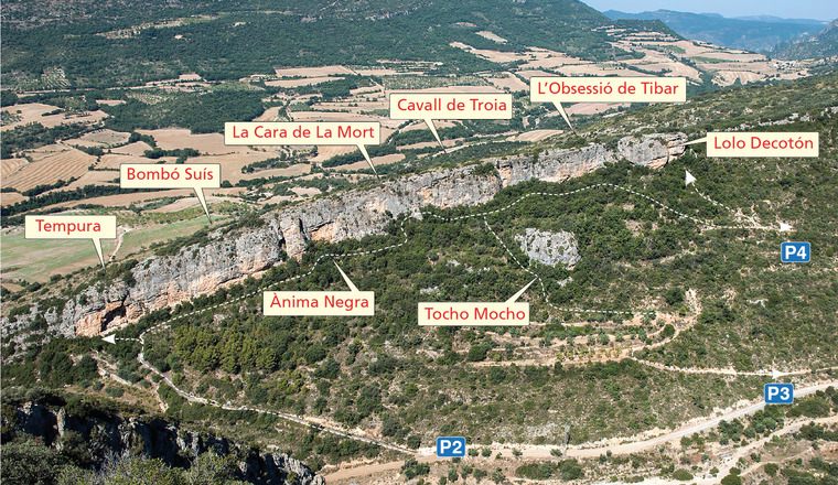General Approach: From the village of Os de Balaguer follow a narrow road heading towards Tartareu (7km). Approximately 250m before reaching the village a dirt track cuts off to the left, heading up the valley of Barranc d’Espinau. The first parking area (P1) is situated about 500m up the track near a tarmac pathway heading up towards the left-hand end of the cliff. P2 is located some 270m further up the main track, just after a passing another side-track (unsurfaced this time) leading back leftwards. P3 lies a further 300m up the main track, from where two well-marked walking paths lead back leftwards towards the right-hand sectors of the cliff. Note: it is also possible to approach the village of Tartareu from the north by turning off the C-12 main road 4km north of the village of Les Avellanes. However, to reach the crag this way means driving through the village of Tartareu itself, whose extremely narrow streets are not suitable for larger vehicles (certainly not big motorhomes!).