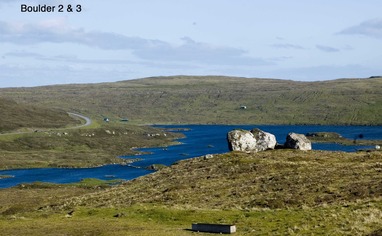 Tp get to boulder II & III continue in the same direction for about 100 meters. The two boulders lie alone with a nice vue over the little lake (toftírvatten) and the stadium in Runavik.