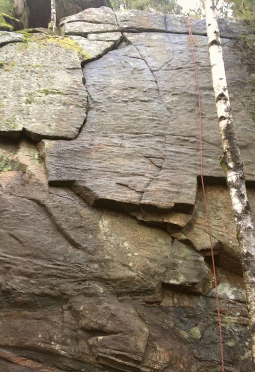Originally done as a boulder. The small wall is located a short distance beyond the Säpo route in the direction of the lakes. Fine line in its shortness, 2 hangers + “trunk”anchor. Boulted (and namned) as a sport route 2021 by Henric Bjuveus, Borås KK