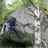 Yksinäinen muutaman reitin matala kivi harvaan hakatulla metsä alueella. Alastulomaastot hyvät.