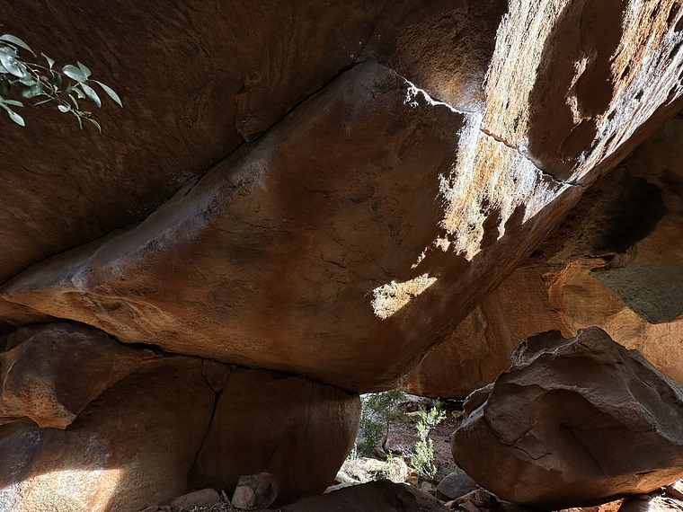 first try, top out around the corner on the hanging boulder. mega