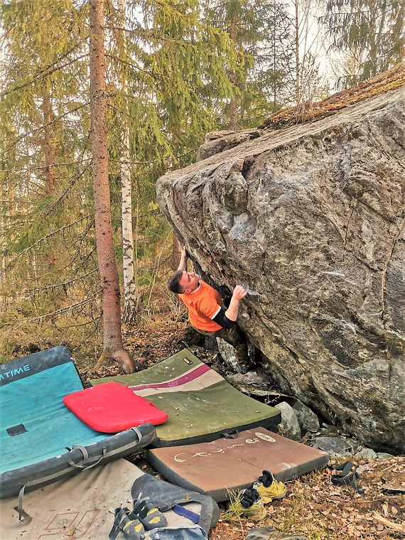 Ugrikivi is a nicely formed boulder with pretty good rock quality and some nice holds on it. It's got some highish problems and some low stuff as well, and the routes vary from low overhang to highish slabs and vertical routes, so there's something to do for everyone here. And overall quality of the routes is pretty good too!