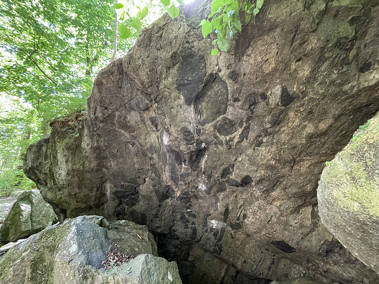 Cool boulder in a 40 degree overhang on dark grey rock which is smoother than the rest of Utby. You feel badass climbing it, like D.Woods low gear machine style, giving multiple opportunities to show off your biceps strength in static moves. Semi-hard first half into powerful crux with a small incut undercling which you dyno to the lip from, a move which feels quite scary until you have commited a few times. Too bad the landing sucks and it is so moist and dark that you almost need a headlamp during daytime.