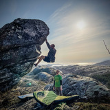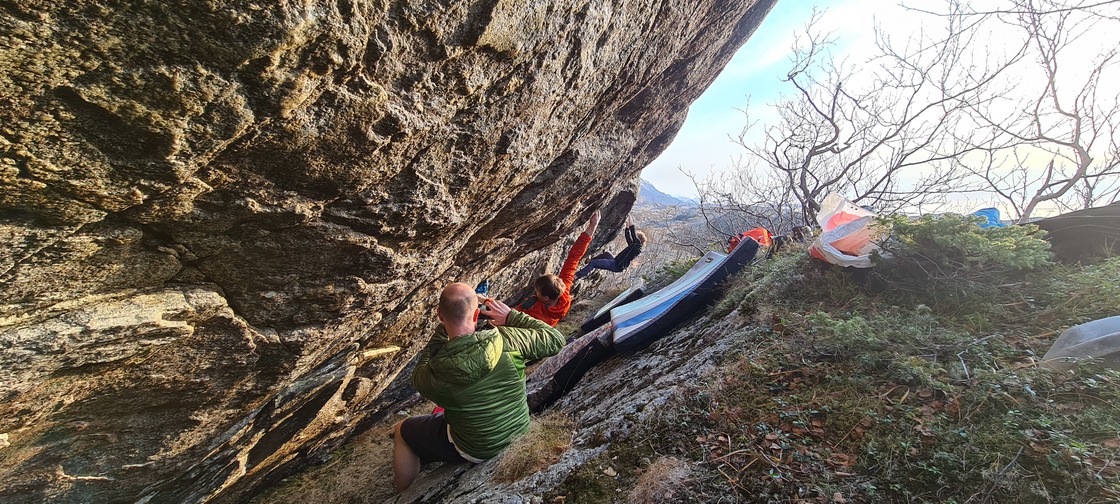 ⛰Valvikdalen is in reality the whole big valley where this crag is located. The crag consists of a few slightly to steep overhanging walls with incut holds of many shapes and sizes. The quality of the rock is mediocre and requires a good deal of brushing to de-choss. But one can't complain too much about this as it is rare to find long steep walls with holds in this region. And the views cmbined with a short apporach makes for a good post-work afternoon crag in the sun.
