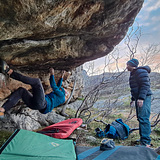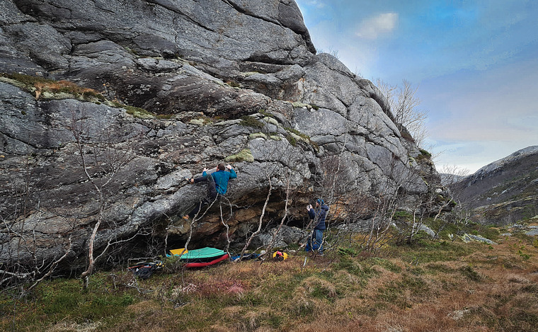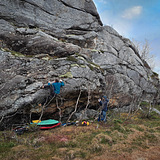 The crag is so far just one steep roof with a few hard problems. It looks shabby from afar but the routes are really nice. The rock quality is not too chossy but it's sharp. The roof faces south west so it should get some sun in late spring through fall.