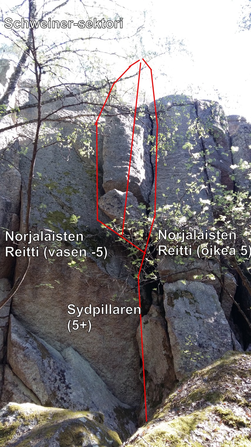 Schweiner-sektori: Norjalaisten reitti, vasen (5-); Sydpillaren (5+); Norjalaisten reitti, oikea (5)