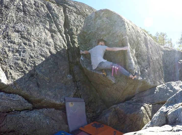 Starfish ståstart. Beta för korta: Hh på högra areten, vh på rail. Hög hf, knälås mot rail. Ta vänstra areten. Upp med fot på rail och starfisha dig upp.