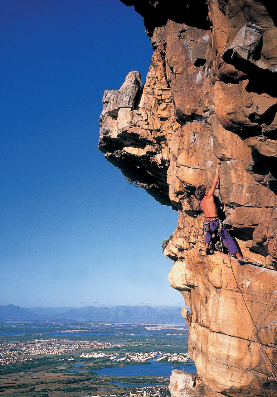 A youthful Tony Lourens enjoying an ascent of Trade Winds (20/6b), The Mine, Cape Peninsula.