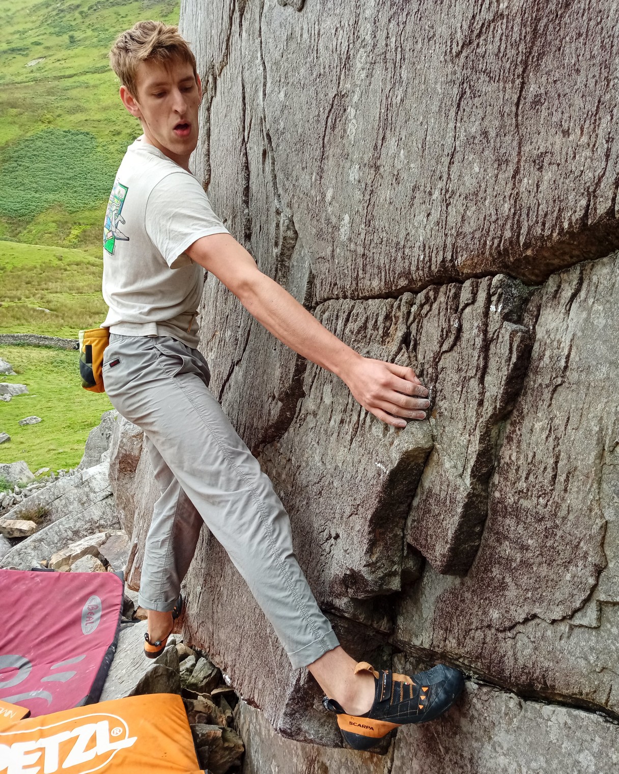 Josh Butler making the thin and excellent moves across the traverse of the cracked bloc during the first ascent