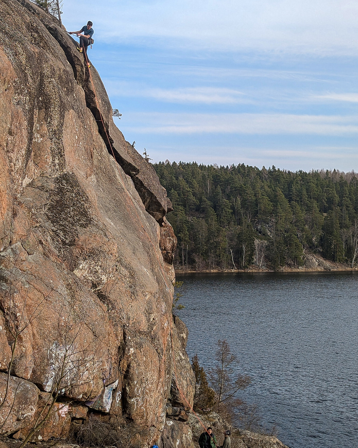 Luka Cindro uppe vid ankaret på leden Calm Crag Voyage (6b).