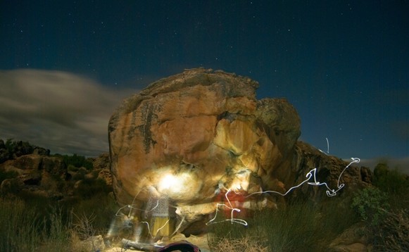 The "Derailed" boulder at night.
